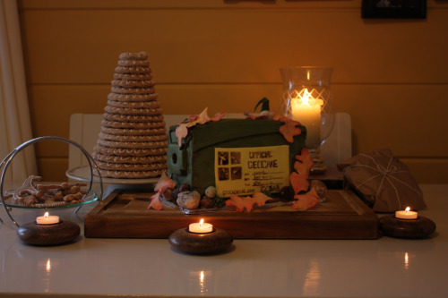 Mannen min syns det var vanskeleg å finne bursdagskake i år! Denne er etter modell av ei ammunisjonskasse (vanleg til bruk i geocaching). Alt i denne kaka var etande, til og med steinane, pinnane og blada! Fondanten er ikkje marsipan, men er heimelaga av marshmallows og melis. Kakebotnen var min vidgjetne eple-squash-krydderkake (utan tilsett sukker - honning er brukt i staden) med kremost fyll. Dette er mi mest bestilte kaketype.
