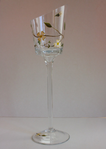 Dogwoodbløming snor seg rundt denne delikate telysholdaren i glas og gløder frå baksida når flammen dansar