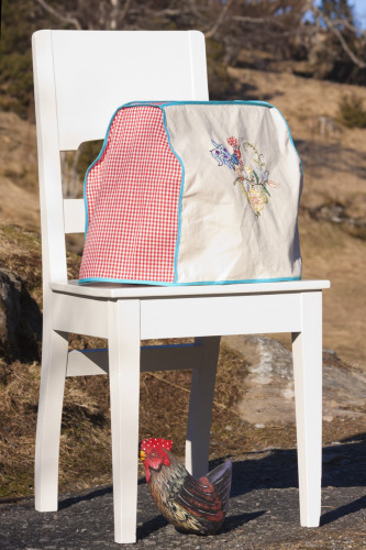 Vår kjøkenmaskin står på kjøkenøya på grunn av manglande rom i skåpene, så eg ville lage eit deksel for den. Ikkje berre for å halde den rein, men også for å bringe litt farge inn i rommet. Denne hanen er brodert på musselin og eg brukte rutete stoff til sidefelta. Eg lagde symønsteret for denne kjøkenmaskinkjolen og kan lage eit for alle typar kjøkenutstyr.