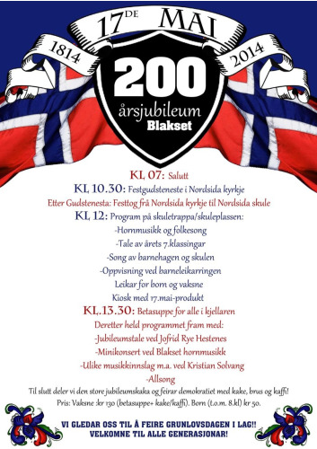 17. mai 2014 var ein stor dag i Norge! Det var 200-årsjubileet for grunnlova og eg vart invitert til å vere med i den lokale 17. maikommiteen. Eg tok på meg å lage plakat siden eg hadde bakgrunn frå grafisk design. Sjølv om det var ei masse med informasjon som skulle vere med så fekk eg plass til alt og samstundes gjere den festeleg.
