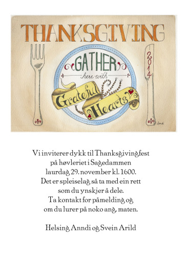 Denne invitasjonen måla med vannfargar vart brukt til vår norsk-amerikanske Thanksgiving-middag i 2014. Handteikna invitasjonar er tilgjengeleg for mange ulike situasjonar: frå invitasjonar og takkekort til personlege romdekorasjonar. Bilda kan også scannast og brukast til Facebook-hendingar eller epost-invitasjonar.
