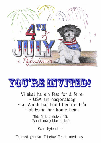 Vår familie fekk ein ny kvalp rett før vår 4. juli-fest i 2014, så eg teikna eit bilete av henne med fargeblyant og blekk til invitasjonen. Handteikna invitasjonar er tilgjengeleg for mange ulike situasjonar: frå invitasjonar og takkekort til personlege romdekorasjonar. Bilda kan også scannast og brukast til Facebook-hendingar eller epost-invitasjonar.